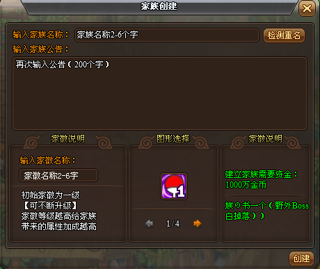 角色無(wú)家族情況下,點(diǎn)擊【創(chuàng)建家族】按鈕,打開(kāi)創(chuàng)建家族面板。