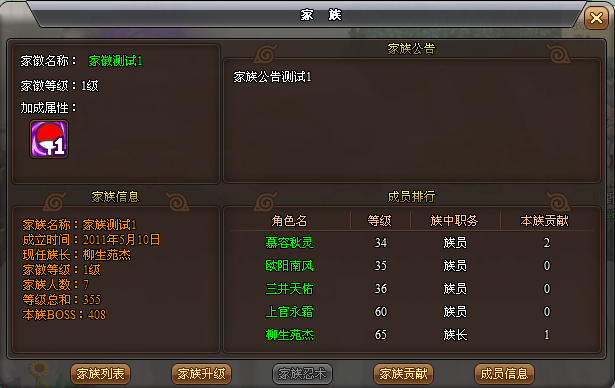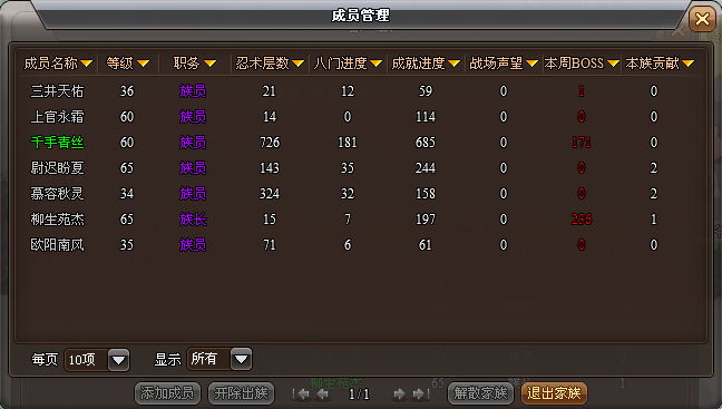 在家族界面里選擇【成員信息】,可以打開(kāi)成員信息管理界面,就可以進(jìn)行添加成員、開(kāi)除成員、解散家族、退出家族等相關(guān)操作。