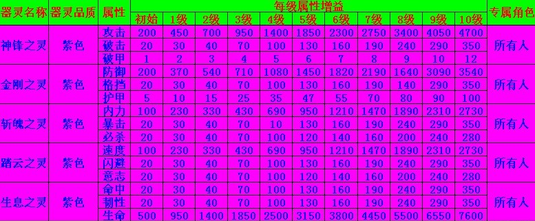 金色器靈1-5級(jí)屬性一覽:(數(shù)據(jù)殘缺,如有玩家能提供在論壇中給安曲或在玩家群中給激石皆可)