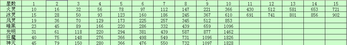 | 神器進(jìn)階數(shù)據(jù) | 守護(hù)進(jìn)階數(shù)據(jù) | 精靈升星數(shù)據(jù) | 圣痕激化數(shù)據(jù) | 女神庇護(hù)數(shù)據(jù) | 龍?jiān)M(jìn)化數(shù)據(jù) |