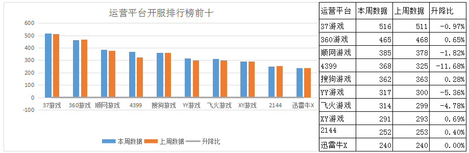 本周運(yùn)營平臺開服排行前三的分別是37游戲、360游戲和順網(wǎng)游戲。榜單數(shù)據(jù)較上周整體有一個較大的增長,增長幅度為13.2%。前十平臺共計開服3510組,占據(jù)1線平臺開服總署的56.3%。前三平臺開服1366組,占榜單開服總署的38.9。4399憑借新一輪發(fā)力重回前十排行榜,其他平臺開服則未有多大的欺負(fù),呈現(xiàn)平穩(wěn)態(tài)勢。
