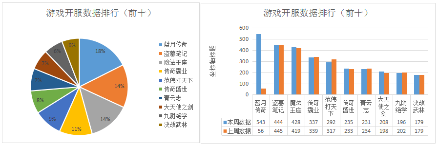 本周榜單較上周未發(fā)生太大變化,其中《大天使之劍》、《九陰絕學(xué)》排名發(fā)生交替。《藍(lán)月傳奇》依然穩(wěn)居榜單第一的位置,《盜墓筆記》、《魔法王座》發(fā)展形勢均良好。上榜游戲總體開服趨勢總體較為穩(wěn)定。