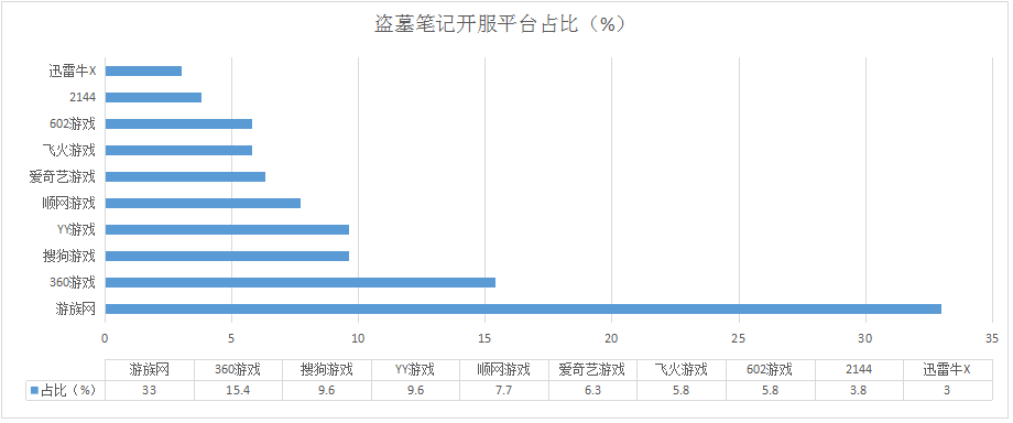 《盜墓筆記》本周開服趨勢保持平穩(wěn),其在游族網(wǎng)開服占比為33%,較上周減少4%。未有新增分布占比平臺。