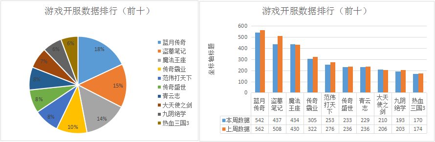 本周網(wǎng)頁游戲開服排行前三游戲?yàn)椋骸端{(lán)月傳奇》、《盜墓筆記》、《魔法王座》。一線平臺共計(jì)開服6010組,其中上榜游戲共開服3006組,占一線平臺開服總數(shù)的50.1%;榜單前三游戲共開服1413組,占榜單開服總數(shù)的47.0%,與上周基本持平。