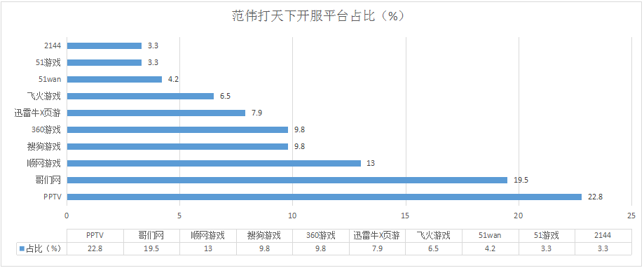 《范偉打天下》本周開服總數(shù)有所滑落,其在迅雷牛X頁游和51wan的開服占比下降較大,但在哥們網(wǎng)的開服占比回升了5.5%;未有新增分布占比平臺。