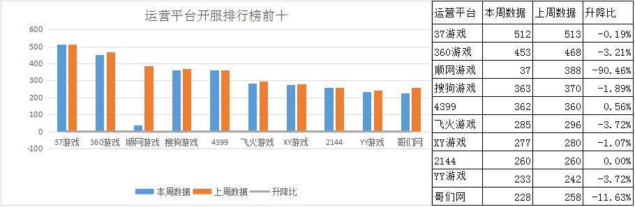 本周一線平臺(tái)開服前三依舊是37游戲、360游戲和順網(wǎng)游戲,而且除了第九第十的YY游戲和哥們網(wǎng)換了個(gè)位置外,前十榜單整體也沒有什么變動(dòng)。