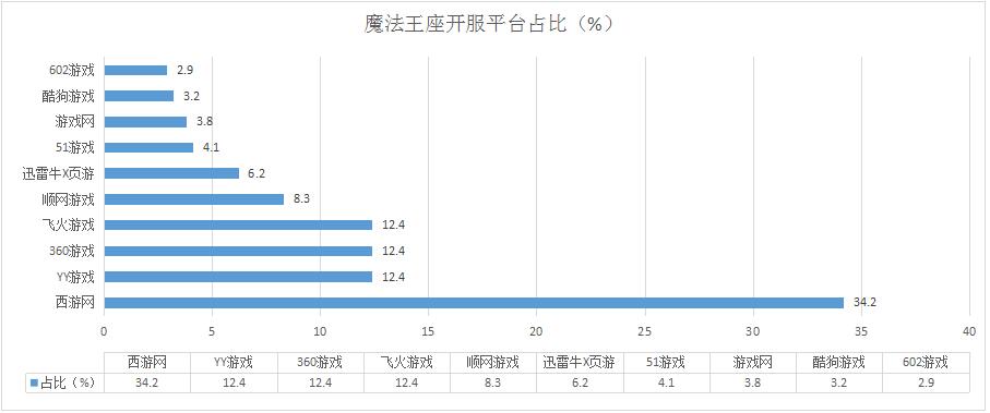 本周《魔法王座》開服較上周減少11.9%,西游網(wǎng)下調(diào)了其開服頻率為主因,其在西游網(wǎng)開服占比也相應(yīng)減少11.5%。其余平臺(tái)開服形勢(shì)變化不大,新增分布占比平臺(tái)游戲網(wǎng)、酷狗游戲、602游戲。