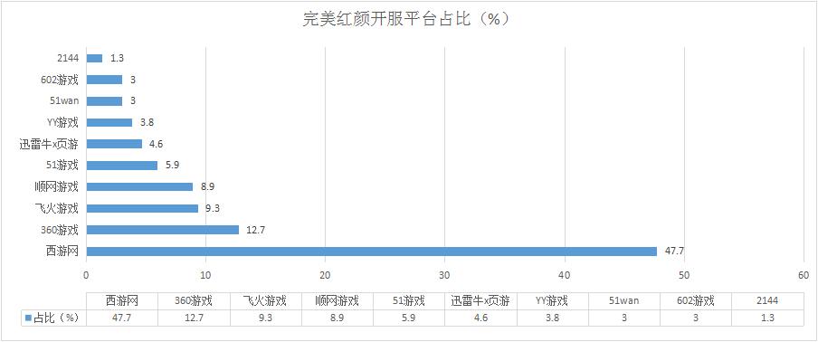 《完美紅顏》本周開服總數(shù)有所下跌,其在西游網(wǎng)的開服數(shù)有所減少,開服占比被稀釋至半數(shù)以下;未新增分布占比平臺。
