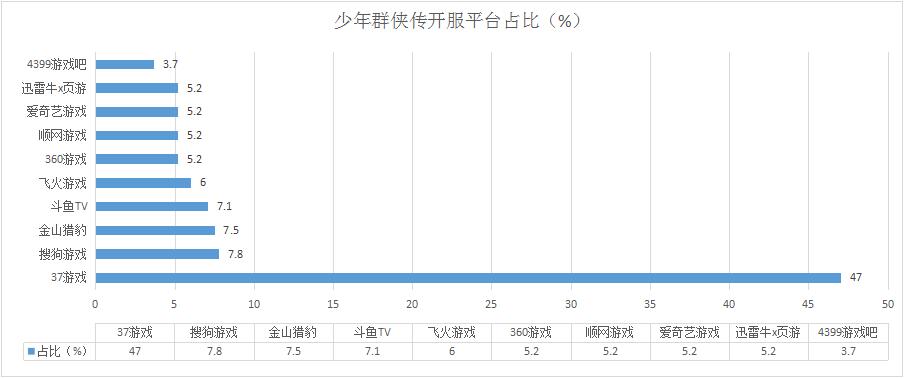 本周《少年群俠傳》開服總數(shù)略有下滑,其在37游戲的開服占比依舊接近半數(shù),高達47%;新增分布占比平臺360游戲。