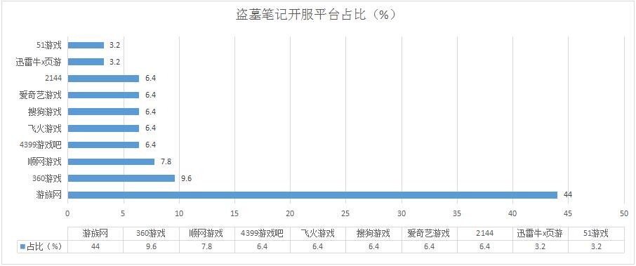 《盜墓筆記》本周開服總數(shù)同樣略有下降,其在搜狗游戲的開服占比降低至6.4%,開服頻率下調(diào)至2服/天;未新增分布占比平臺。