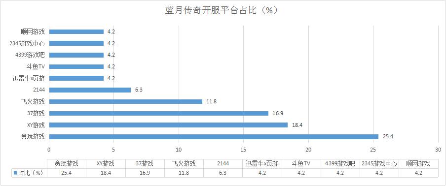 本周《藍(lán)月傳奇》開服較上周減少2.9%,但其開服趨勢(shì)依然保持穩(wěn)定,各平臺(tái)開服占比也均未發(fā)生明顯變化。新增分布占比平臺(tái)迅雷牛X頁(yè)游、斗魚TV。