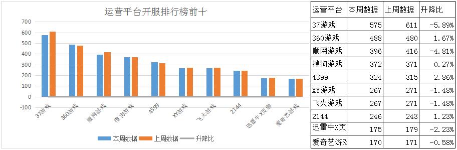 本周運(yùn)營(yíng)平臺(tái)開(kāi)服排行前三:37游戲、360游戲、順網(wǎng)游戲;其中多數(shù)平臺(tái)開(kāi)服趨勢(shì)未發(fā)生明顯改變,因此平臺(tái)排名較上周基本一致。本周榜單平臺(tái)共計(jì)開(kāi)服3280組,占一線平臺(tái)開(kāi)服總數(shù)的58.1%,該占比較上周增漲0.7%;其中開(kāi)服前三平臺(tái)共開(kāi)服1459組,占榜單開(kāi)服總數(shù)的44.5%。