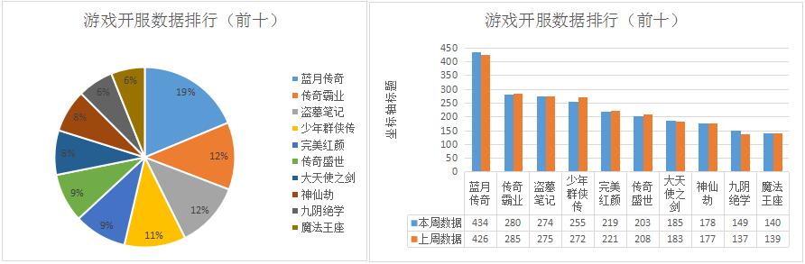 本周榜單游戲排名與上周相比變化不大,整體開服形勢保持穩(wěn)定;《藍(lán)月傳奇》本周開服數(shù)略有增漲,繼續(xù)霸占著榜首之位;而《九陰絕學(xué)》本周開服數(shù)增漲了8.8%,升至榜單第九。