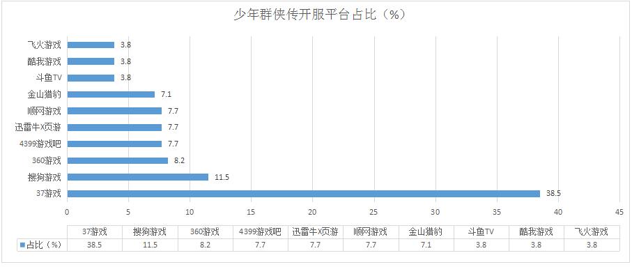 《少年群俠傳》本周開服總數(shù)略有減少,其主要影響來源于360游戲下調(diào)其開服頻率為2服/天。新增分布占比平臺酷我游戲,日均開服1服/天。