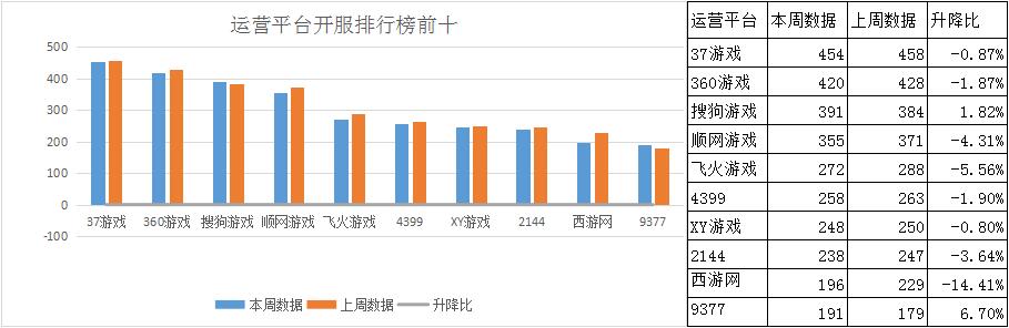 本周各運(yùn)營(yíng)平臺(tái)主打游戲開(kāi)服情況較上周變化不大;其中360游戲《大天使之劍》升至平臺(tái)第一主打游戲,開(kāi)服占比達(dá)到了6.7%;搜狗游戲則將《暮影戰(zhàn)神》、《思美人》加入了平臺(tái)主打游戲之列,開(kāi)服頻率達(dá)到了2服/天。