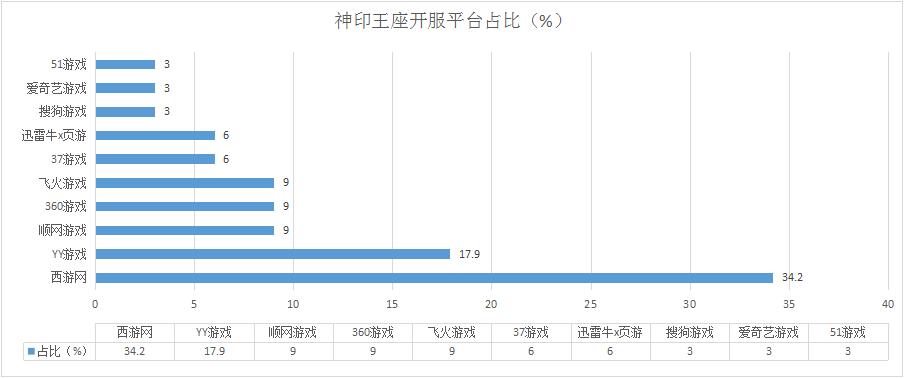 《神印王座》本周開(kāi)服數(shù)同樣略有減少,但整體開(kāi)服趨勢(shì)穩(wěn)定。新增分布占比平臺(tái)搜狗游戲、愛(ài)奇藝游戲。