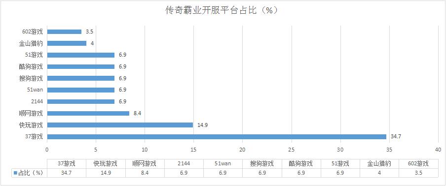 《傳奇霸業(yè)》本周開(kāi)服總數(shù)較上周略有減少,但在各平臺(tái)的分布占比基本未發(fā)生變化。新增分布占比平臺(tái)金山獵豹、602游戲。