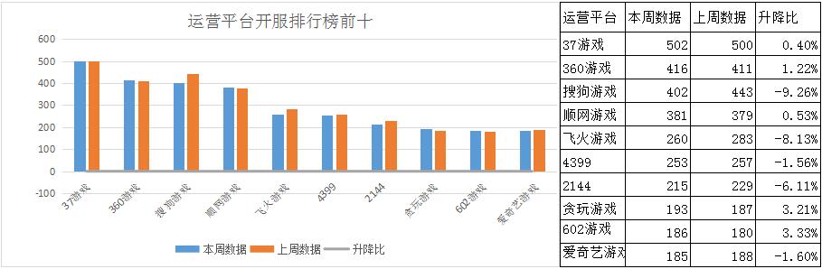 與搜狗游戲不同的是,一直以來(lái)霸占前三的另外兩家游戲本周都多少增加了開(kāi)服數(shù)量。其中行業(yè)龍頭37游戲本周增開(kāi)2組,總開(kāi)服數(shù)達(dá)到了502組。而與搜狗游戲相愛(ài)相殺的360游戲本周也增開(kāi)了5組服務(wù)器,開(kāi)服總數(shù)達(dá)到了416組。本周榜單前三開(kāi)服總數(shù)1320組,相較上周下降了33組,下降的數(shù)量都在搜狗游戲身上。榜單前三開(kāi)服占比44.1%,在榜單整體開(kāi)服下降的趨勢(shì)下,占比反而較上周上升了0.1個(gè)百分點(diǎn)。