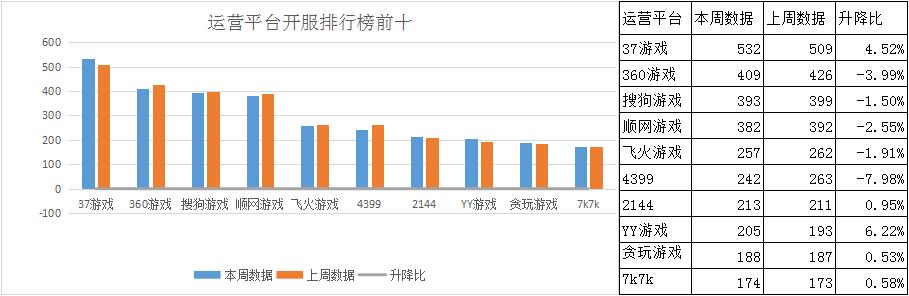 本周運(yùn)營平臺(tái)開服排行前三:37游戲、360游戲、搜狗游戲;本周榜單平臺(tái)整體開服情況較上周變化不大;7K7K新上榜,排名榜單第十。本周榜單平臺(tái)共開服2995組,占一線平臺(tái)開服總數(shù)54.7%;其中開服前三平臺(tái)共開服1334組,占榜單開服總數(shù)44.5%。