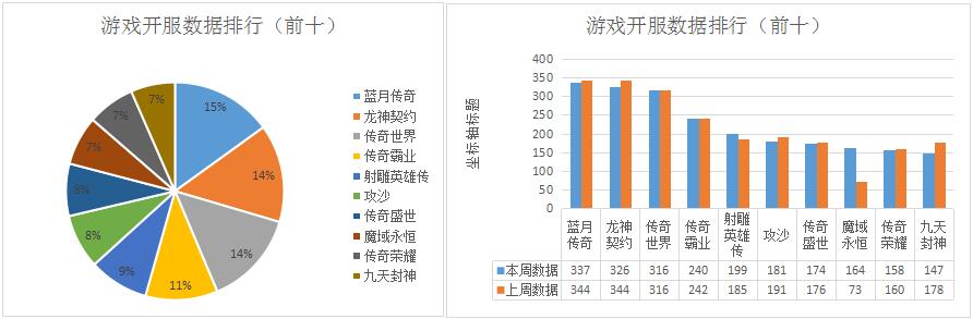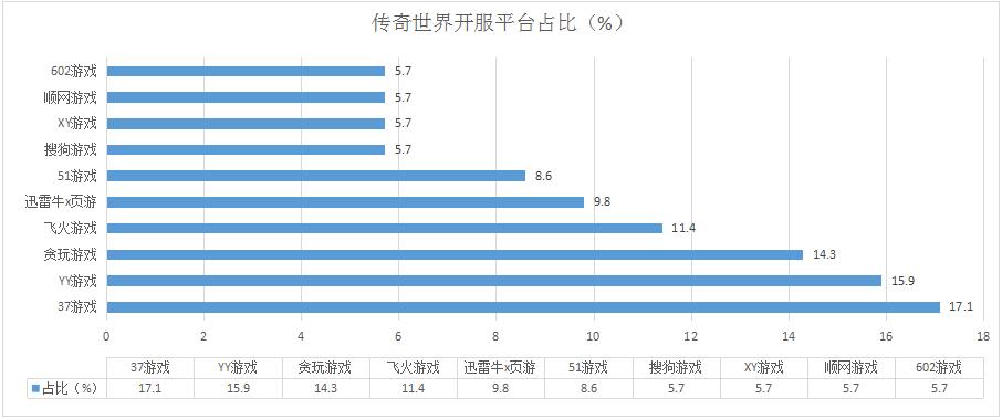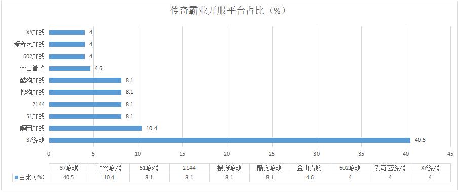 《傳奇霸業(yè)》本周開服數(shù)同樣保持穩(wěn)定,各平臺的分布占比情況也未發(fā)生明顯變化,新增分布占比平臺愛奇藝游戲、XY游戲,開服頻率皆為1服/天。