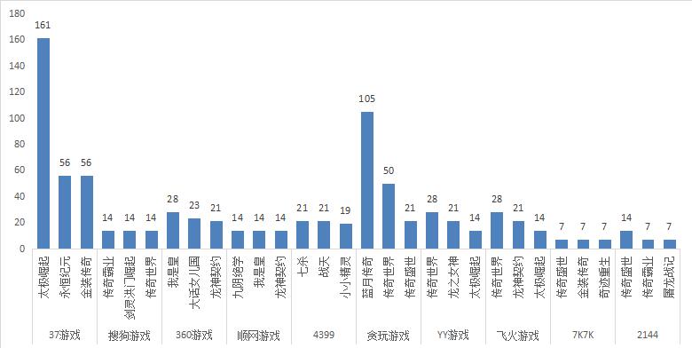 本周各運(yùn)營(yíng)平臺(tái)主打游戲開(kāi)服與上周相比基本未發(fā)生變化,360游戲?qū)ⅰ洞笤捙畠簢?guó)》和《龍神契約》推為了平臺(tái)主打游戲,開(kāi)服頻率皆為3服/天。