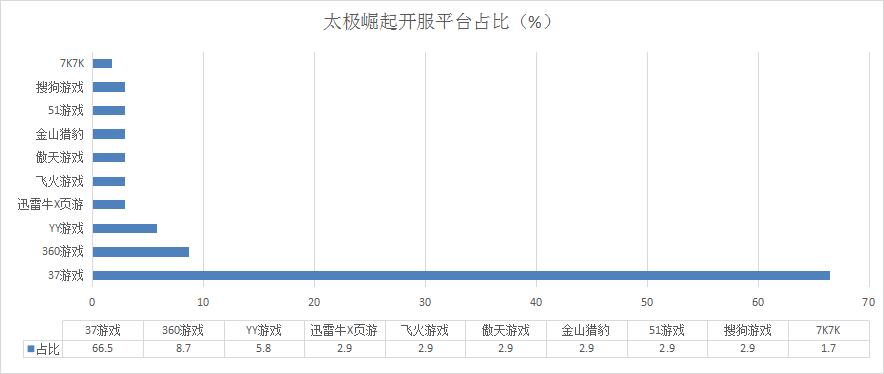 本周《太極崛起》開(kāi)服總數(shù)較上周有所增漲,其在37游戲開(kāi)服頻率峰值高達(dá)23服/天,新增分布占比平臺(tái)7k7k。