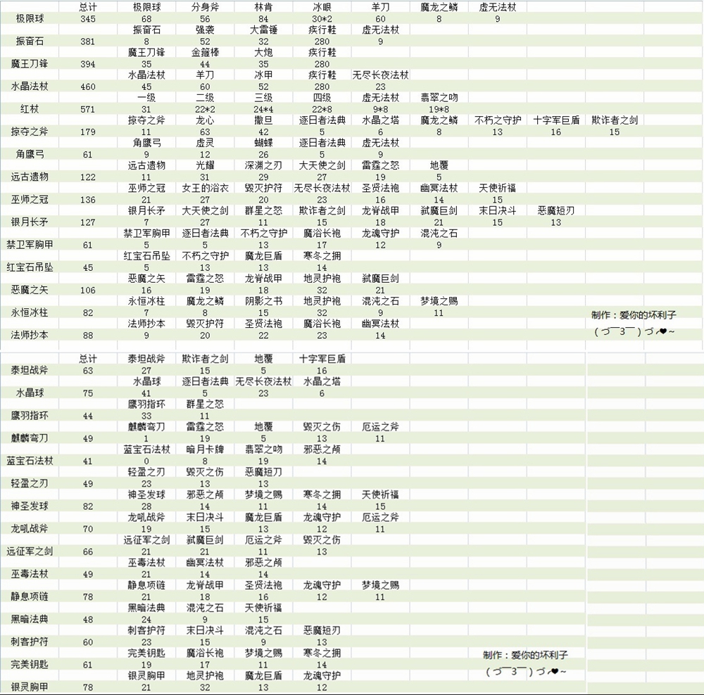 整理說明:是總結(jié)了目前70名英雄(包括魂匣)的裝備統(tǒng)計,只統(tǒng)計了緊缺以及需求多的單件裝備,并不包括覺醒裝備。
