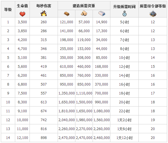 2、爆破加農(nóng)炮升級(jí)詳細(xì)數(shù)據(jù):
