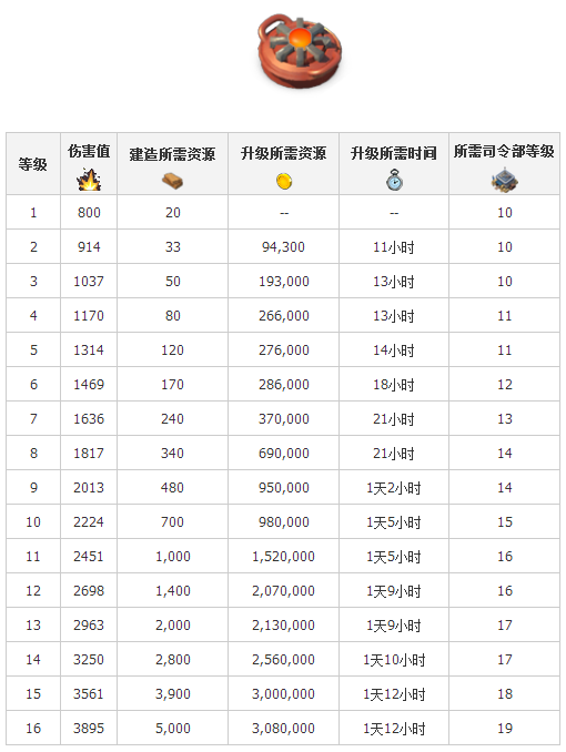 2、高爆地雷升級(jí)詳細(xì)數(shù)據(jù):
