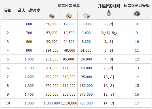 2、潛水艇升級(jí)詳細(xì)數(shù)據(jù):