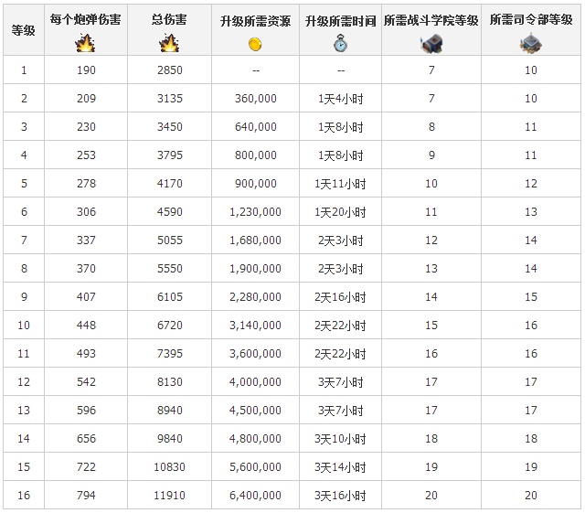 1、多管火箭炮升級(jí)詳細(xì)數(shù)據(jù):