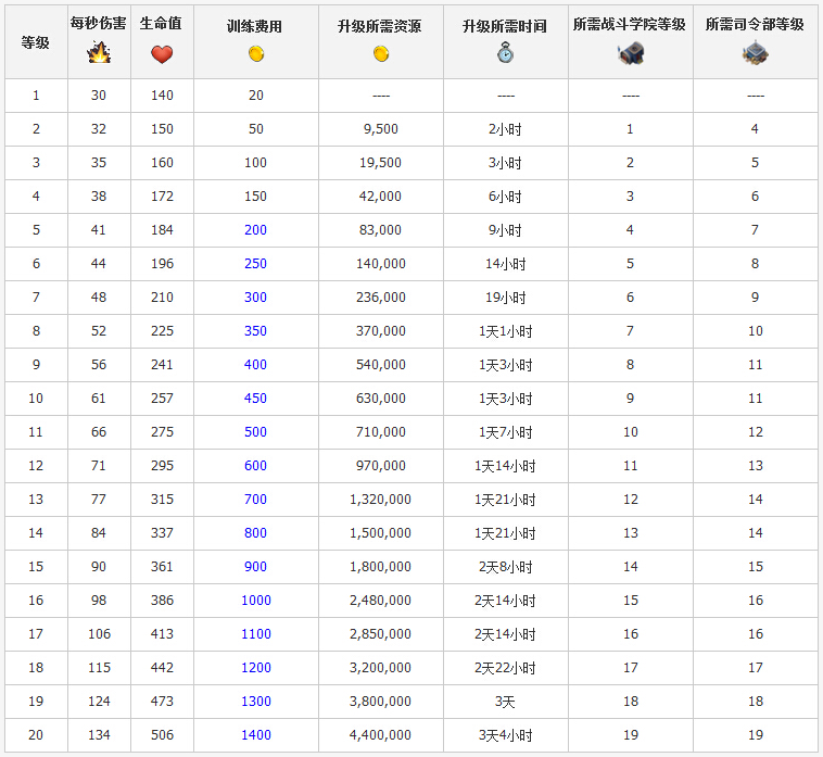 1、步兵升級詳細數據: