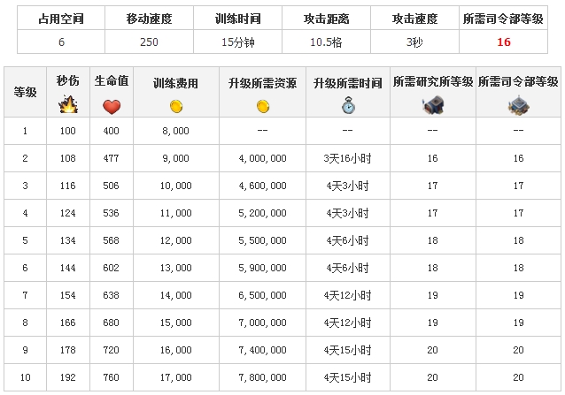 1、投彈兵升級(jí)詳細(xì)數(shù)據(jù):